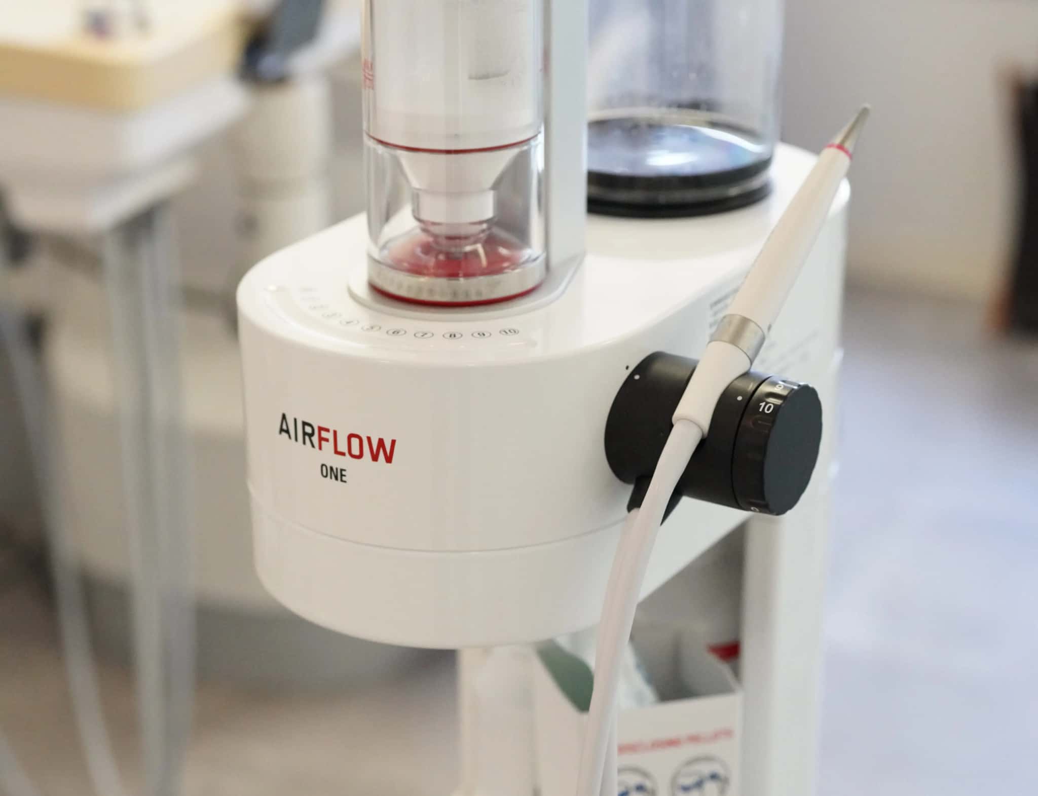 エアフローワンは、専用の微細なパウダーをジェット噴射で歯に吹き付け、歯面の汚れや細菌の塊(バイオフィルム)を除去することを目的とした機器です。